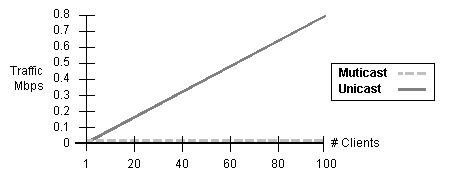 Multicasting takes the strengths of both of these approaches and avoids their weaknesses. Multicasting sends a single copy of the data to those clients who request it. Multiple copies of data are not sent across the network, nor is data sent to clients who do not want it. Multicasting allows the deployment of multimedia applications on the network while minimizing their demand for bandwidth. The following graph compares the network load per client when unicasting an 8 Kbps PCM audio stream and multicasting the stream and shows how a multicast saves bandwidth.